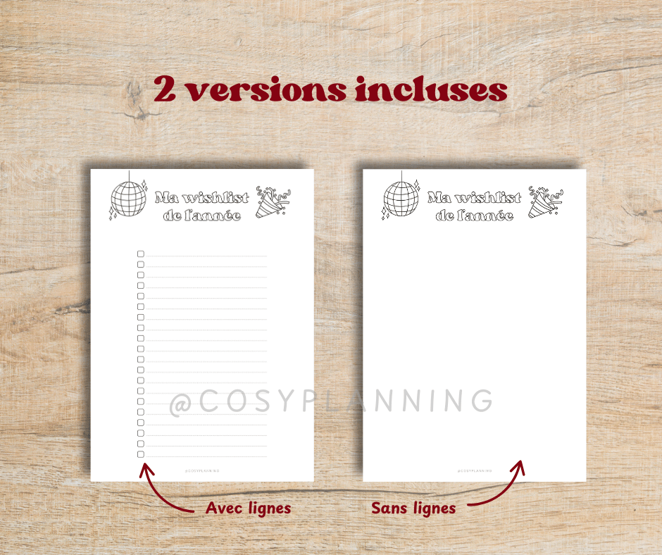 Ce produit comprend 2 pages imprimables en noir et blanc pour noter (ou coller) ce dont tu as envie cette année.
