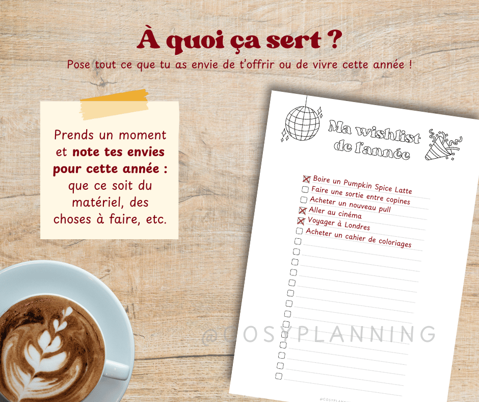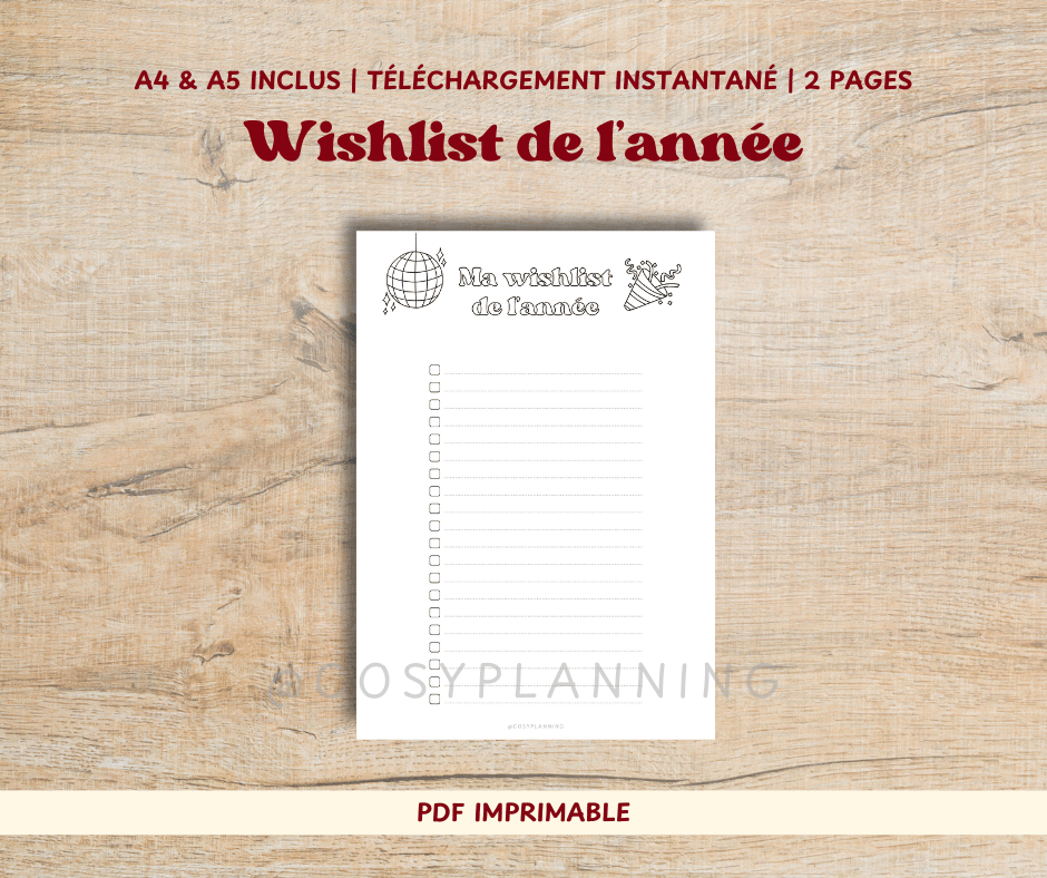 - Une wishlist de l'année vierge (pour coller des images, photos, illustrations, etc.)